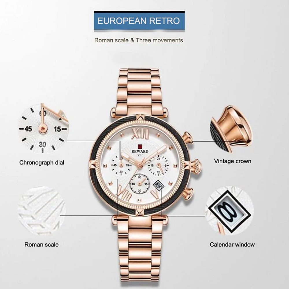 REWARD ساعة نسائية فاخرة ، مقاومة للماء ، حركة كوارتز ، فستان كاجوال بحزام فضي ذهبي مربع - QUEN905